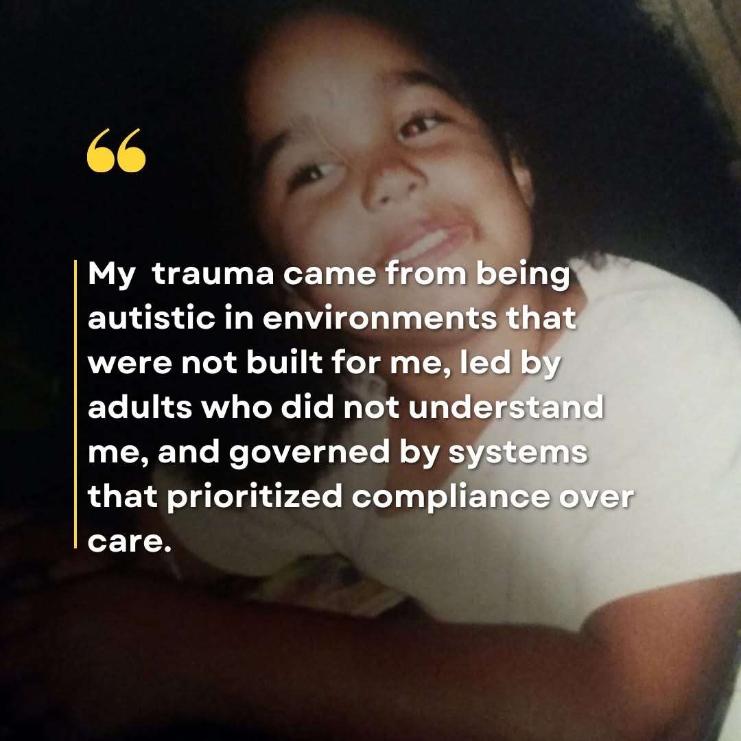 The truth is this: autism did not cause my pain; trauma did. And that trauma came from being autistic in environments that were not built for me, led by adults who did not understand me, and governed by systems that prioritized compliance over care. When an autistic child’s needs are repeatedly unmet, misunderstood, or punished, trauma is not an exception… it is an outcome!!