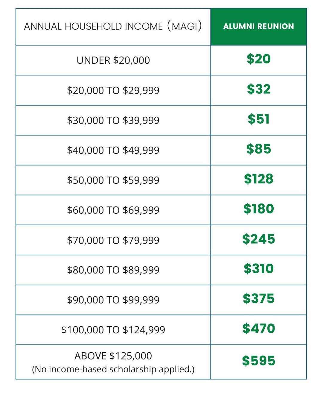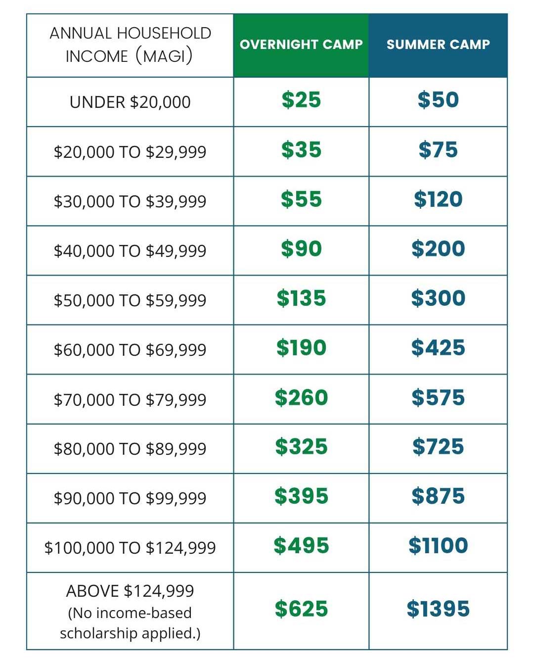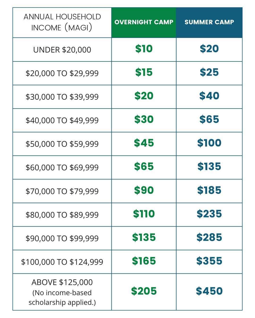 Sliding Scale Scholarship Support, based on annual household income, is being implemented in 2026. Families that would like to receive a reduced tuition rate through this Sliding Scale will be required to submit proof of income using their modified adjusted gross income (MAGI) from the previous year's tax return. We've included some helpful charts below to help you understand what your cost will be for camp before filling out the application and requesting Scholarship Support.